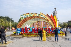 Trục trung tâm công viên được lựa chọn làm không gian chính của đường hoa, với bố cục đối xứng hai bên tượng đài Lý Thái Tổ. Cụm mô hình lớn “Bắc Ninh 2023 – Xuân Quý Mão” được đặt nổi bật giữa sân quảng trường, kết hợp hoa tươi đa sắc, họa tiết cách điệu từ làn điệu dân ca Quan họ, sóng nước và hoa văn truyền thống. Tông đỏ – vàng chủ đạo giúp tổng thể vừa trang trọng vừa rực rỡ sắc xuân.