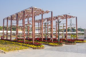 Hệ trụ cảnh treo cũng được thiết kế thành đường dạo hoa kéo dài, sử dụng chậu treo kết hoa petunia, phong lữ và xác pháo, xen kẽ với đèn trang trí và dàn nón tạo bóng. Lối đi được lát gọn, hoa tươi rải đều tạo thành các mảng chuyển tiếp, không chỉ đẹp mắt mà còn mang đến trải nghiệm thư giãn cho người đi bộ.
